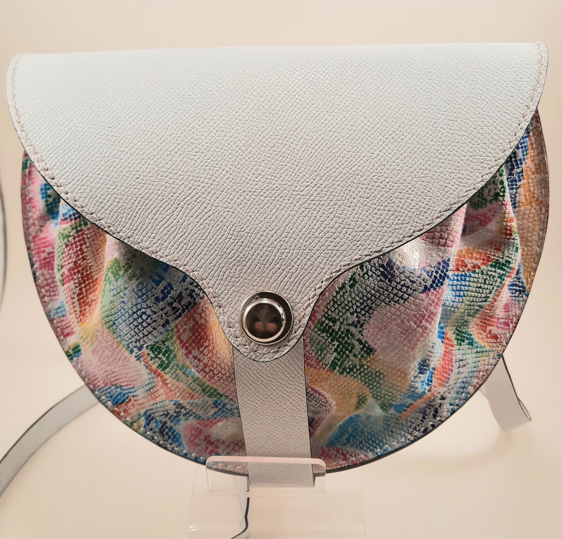 Pour un anniversaire, sac MUSE en blanc avec la poche imprimée genre mosaïque. Fermoir de sécurité.