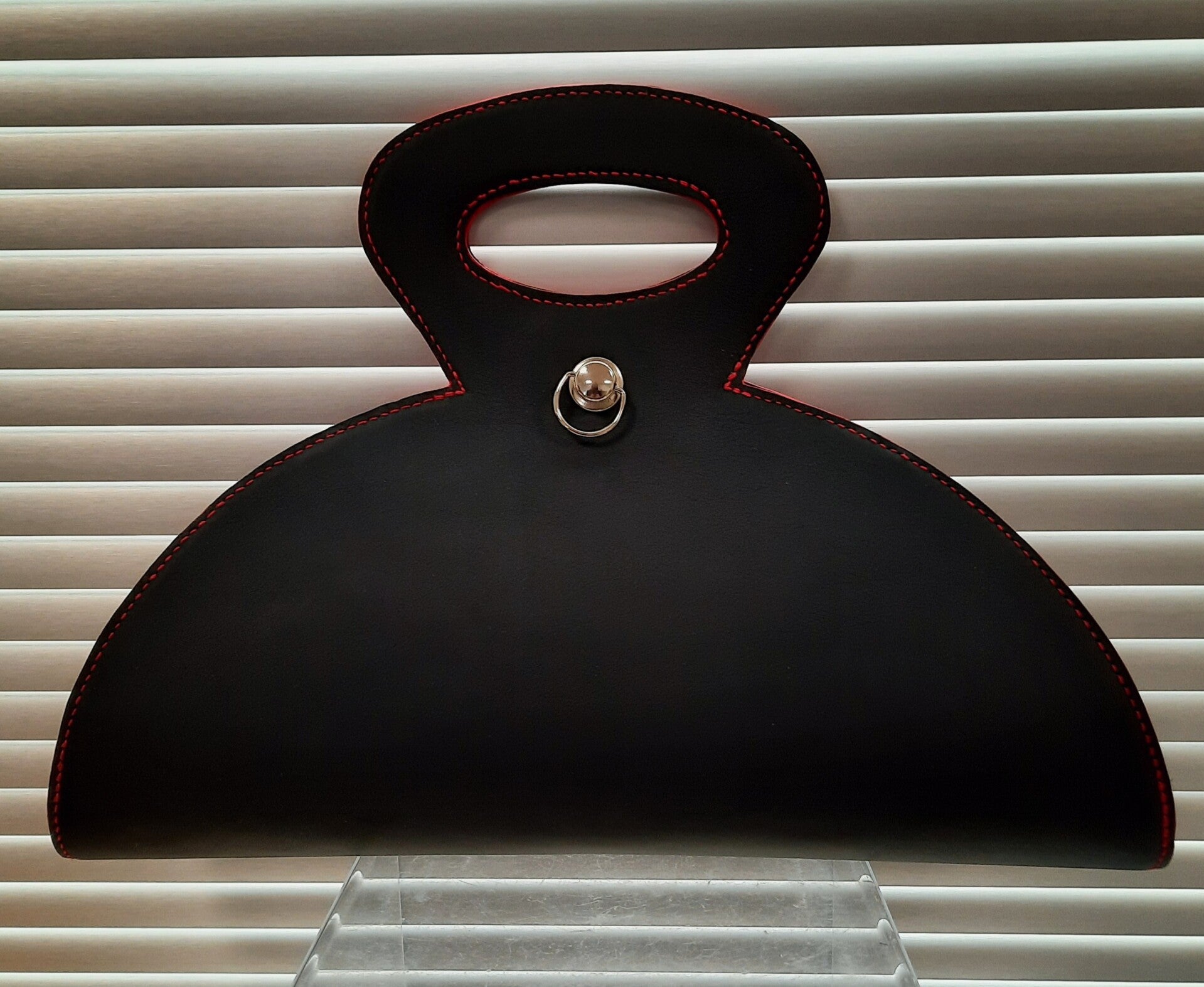 Sac original en noir, intérieur gris graphique, coutures sellier et tranches rouges. C'est une des formes que je réalise régulièrement.