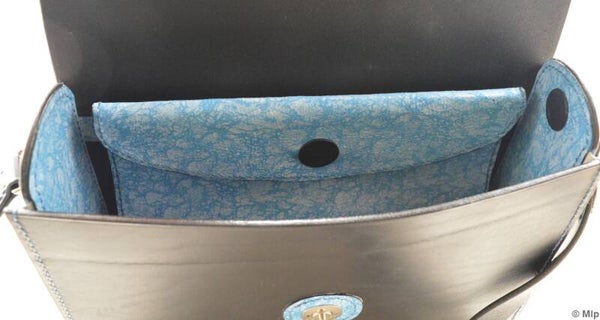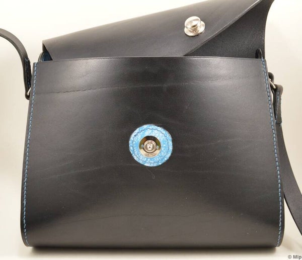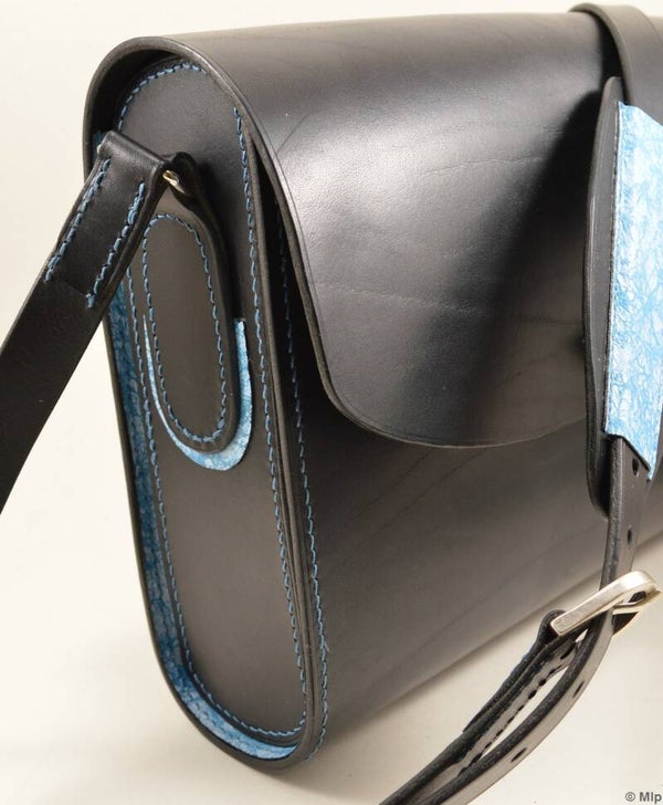 En cuir pleine fleur de bovin noir il est sobre dans sa conception et élégant avec ses petites touches de bleu lumineux. Le noir n'est plus tout à fait noir. Une poche intérieure amovible en chèvre bleue est fixée par pressions. Elle est fermée grâce à un rabat qui rappelle la forme de celui du sac muni d'un fermoir aimanté.