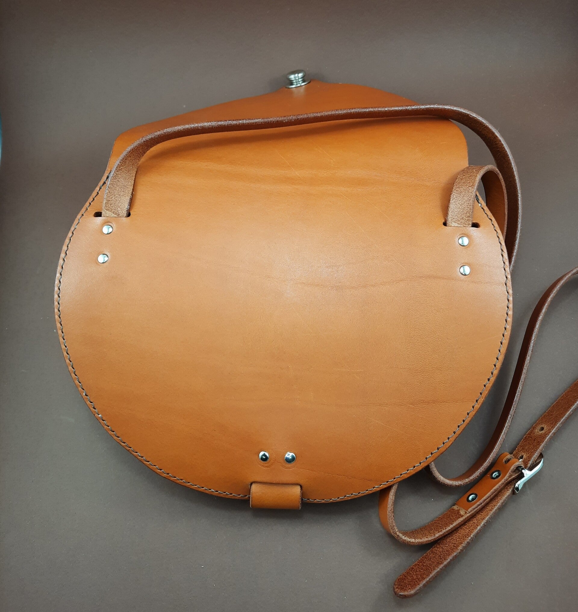 - Dos, rabat, courroies en cuir de vachette épais cognac,
